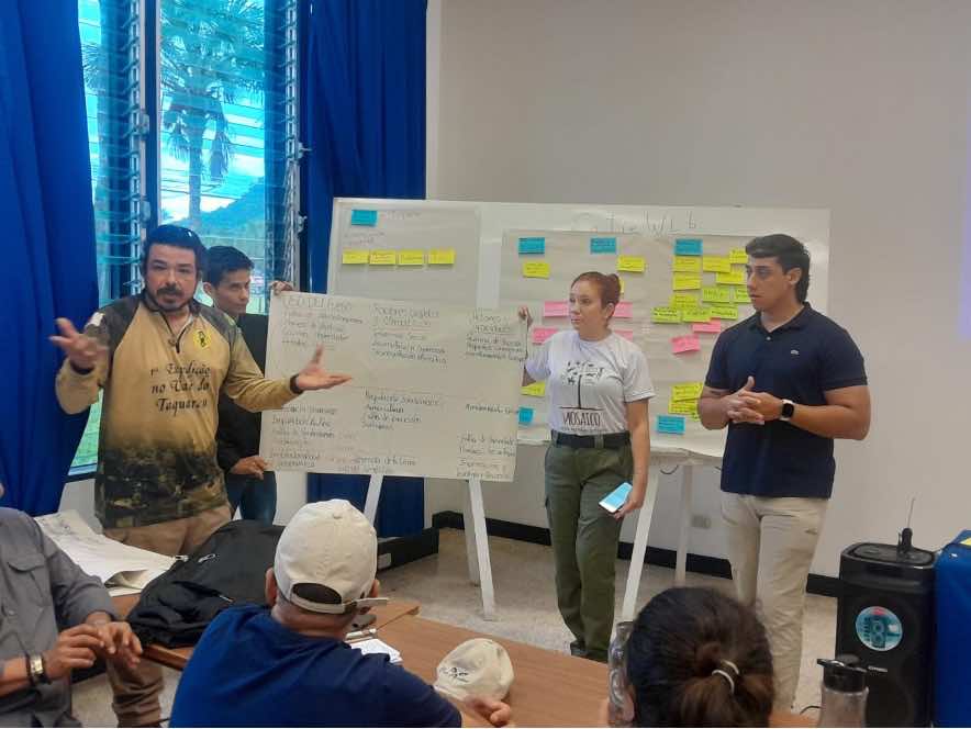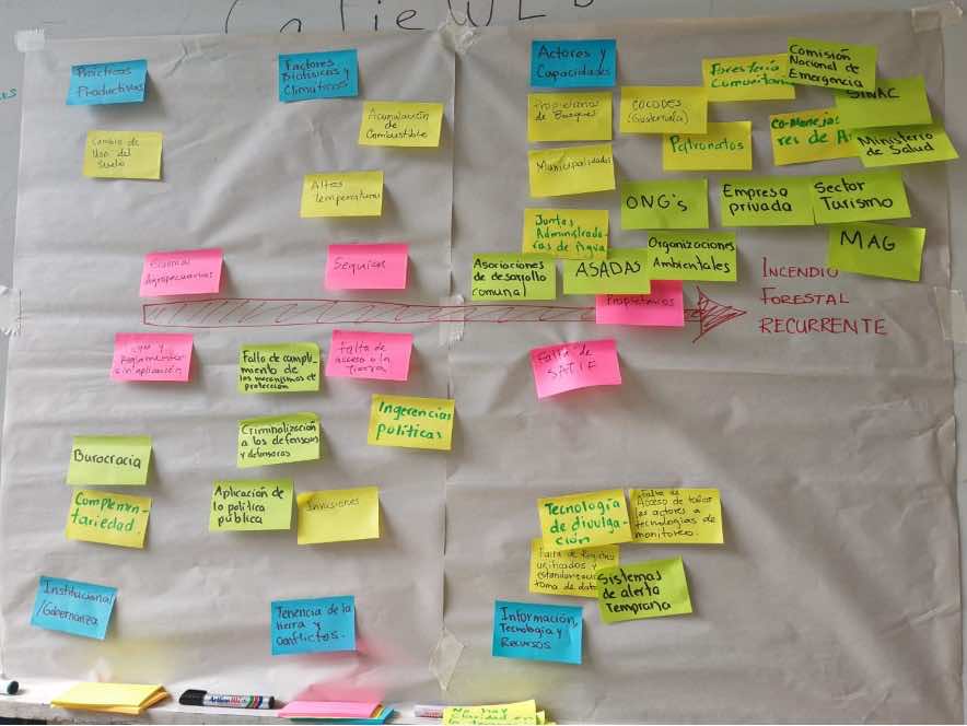 Durante el taller se realizaron múltiples actividades grupales en donde los representantes de los BM trabajaban en conjunto para reunir sus perspectivas individuales en una visión regional sobre aspectos vinculados con la gobernanza del fuego. Algunos de los conceptos trabajados en estas sesiones grupales incluyeron: la identificación de causas de incendios, los actores involucrados en la gestión del fuego, la disponibilidad o falta de información relevante.